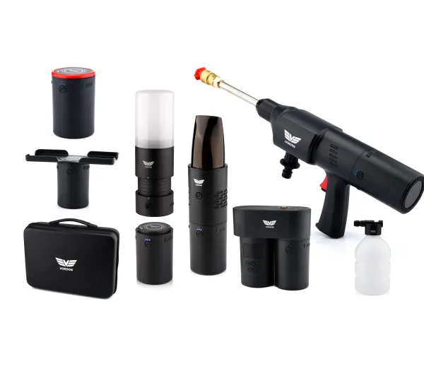 - Funkcje: kompresor, latarka, myjka, odkurzacz, powerbank