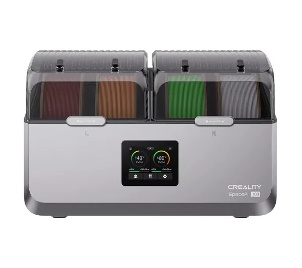 <h2>Suszarka do filamentu Creality SpacePi X4</h2><p>Creality SpacePi X4 to zaawansowane urządzenie do suszenia filamentów, które pozwala na jednoczesne przygotowanie aż czterech szpul w dwóch osobnych komorach z regulowaną temperaturą od 45 do 85°C. Zastosowana technologia aktywnego suszenia, szybkie nagrzewanie oraz cicha praca sprawiają, że SpacePi X4 zapewnia stabilne i niezawodne przygotowanie różnorodnych materiałów, takich jak PLA (Polylactic Acid, biodegradowalny plastik na bazie skrobi kukurydzianej), PETG (Polyethylene Terephthalate Glycol, tworzywo łączące cechy PET i glikolu), TPU (Thermoplastic Polyurethane, elastyczny materiał termoplastyczny), ABS (Acrylonitrile Butadiene Styrene, wytrzymałe tworzywo sztuczne) czy PA-CF (Polyamide Carbon Fiber, nylon wzmocniony włóknem węglowym), eliminując przy tym wilgoć, pęcherzyki powietrza i zjawisko strunienia.</p><h2>Niezależne sterowanie temperaturą w dwóch strefach</h2><p>Urządzenie wyposażono w dwie osobne komory grzewcze, które można kontrolować niezależnie, umożliwiając jednoczesne suszenie różnych typów filamentów w optymalnych dla nich warunkach. Przykładowo, w jednej komorze można ustawić 50°C dla PLA, a w drugiej 85°C dla PA-CF. Taka elastyczność znacząco ułatwia pracę w środowisku, gdzie używa się wielu materiałów, pozwalając na oszczędność czasu i energii.</p><h2>Efektywne i szybkie nagrzewanie</h2><p>Dzięki zastosowaniu podwójnych grzałek PTC o łącznej mocy 400 W, suszarka osiąga temperaturę 85°C już w 20 minut. Obieg ciepłego powietrza w zakresie 360° gwarantuje równomierne rozprowadzenie temperatury, a nowoczesna technologia SpaceDry 4.0, oparta na aktywnej dehumidifikacji oraz regenerującym się środku osuszającym, skutecznie usuwa wilgoć z filamentów bez konieczności wymiany materiałów eksploatacyjnych.</p><h2>Cicha praca i oszczędność energii</h2><p>Creality SpacePi X4 pracuje wyjątkowo cicho, utrzymując poziom hałasu w przedziale 43–46 dB, co pozwala na komfortowe użytkowanie zarówno w domu, jak i w warsztacie. W trybie jednokomorowym zużycie energii wynosi jedynie 0,124 kWh, a w dwukomorowym 0,208 kWh, co przekłada się na niskie koszty eksploatacji przy zachowaniu pełnej efektywności suszenia.</p><h2>Kompatybilność z różnymi szpulami</h2><p>Urządzenie obsługuje filamenty o średnicy 1,75 mm i 2,85 mm, a także szpule o średnicy do 200 mm i szerokości do 150 mm. Dzięki temu można z powodzeniem suszyć zarówno standardowe szpule 1 kg, jak i większe, ważące do 2 kg, co zapewnia elastyczność w codziennym użytkowaniu.</p><h2>System zabezpieczeń i kontrola temperatury</h2><p>W trosce o bezpieczeństwo użytkowania, suszarka została wyposażona w potrójny system ochrony: kontrolę pracy wentylatora, zabezpieczenia temperaturowe grzałek oraz czujniki stale monitorujące warunki wewnątrz komór. Taka konstrukcja chroni filamenty przed przegrzaniem i zapewnia bezpieczną eksploatację urządzenia.</p><h2>Komfort i funkcjonalność na co dzień</h2><p>Wbudowane podświetlenie wnętrza komór, blokada drzwi, rolki chroniące przed poparzeniem oraz szczelna konstrukcja zapobiegająca przenikaniu wilgoci – wszystkie te elementy zwiększają wygodę użytkowania. Dodatkowo, zakończenie procesu suszenia sygnalizowane jest dźwiękiem, co pozwala na łatwiejszą obsługę nawet w intensywnym trybie pracy.</p><h2>Intuicyjne sterowanie procesem suszenia</h2><p>Nowoczesny interfejs EDry UI (User Interface, interfejs użytkownika) umożliwia precyzyjne ustawienie parametrów suszenia – temperatury, czasu pracy (od 1 do 48 godzin) oraz poziomu wilgotności. Użytkownik ma do dyspozycji zarówno tryby automatyczne, jak i możliwość zapisania własnych ustawień, co pozwala dostosować urządzenie do indywidualnych potrzeb i właściwości konkretnego filamentu.</p>