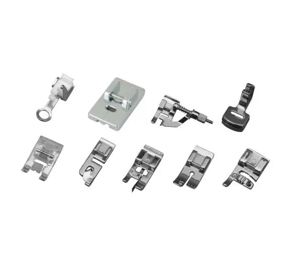 W zestawie: stopka do cerowania, stopka do marszczenia, stopka do obrębiania, stopka do pikowania, stopka do ściegu krytego, stopka do ściegu owerlokowego, stopka do ściegu satynowego, stopka do zamków krytych, stopka do żyłki/sznurka