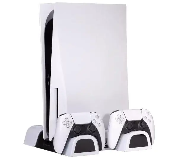 Informacje dodatkowe: podstawka do konsoli PlayStation 5 z funkcją chłodzenia, ładowania i przechowywania, posiada 2 port ładujące do padów DualSense, miejsce na pilota do PS5 oraz na 10 gier