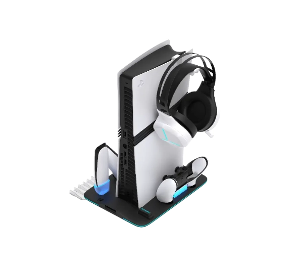 Informacje dodatkowe: Podstawka 3w1 do PS5 Slim i PS5 Pro z funkcją chłodzenia, ładowania 2 padów i organizacji akcesoriów. Obsługuje DualSense i DualSense Edge, oferuje wentylator do 5000 RPM oraz podświetlenie LED.