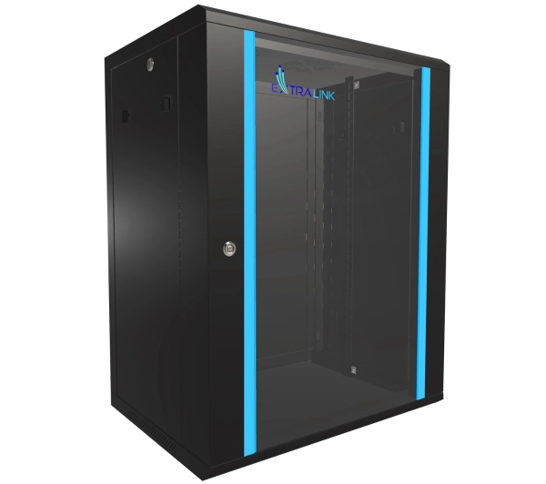 Dodatkowe informacje: Szafa rack Extralink 15U 600×450 mm, montowana na ścianie, pełne blaszane drzwi, zdejmowane panele boczne, przepusty kablowe, udźwig do 120 kg