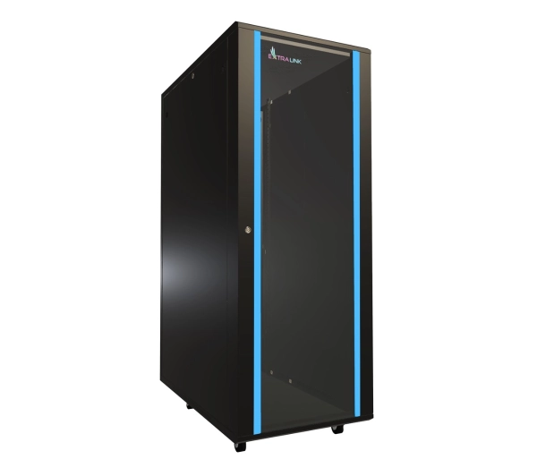 Dodatkowe informacje: Szafa rack Extralink 32U 600×1000 mm, drzwi szklane, zdejmowane panele boczne, przepusty kablowe, opcja montażu wentylatorów, udźwig do 1065 kg