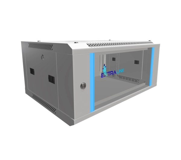 Dodatkowe informacje: Szafa rack Extralink 4U 600×450 mm, montowana na ścianie, przeszklane drzwi, zdejmowane panele boczne, przepusty kablowe, udźwig do 30 kg