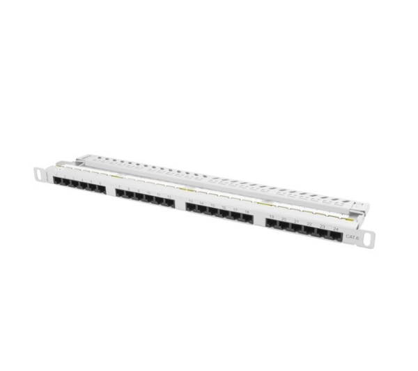 Dodatkowe informacje: Jest pasywnym elementem okablowania strukturalnego stosowanym do zakańczania i organizowania kabli typu skrętka w szafach rack 19". Patch panel wyposażony jest w 24 nieekranowane porty RJ-45 kategorii 6.
