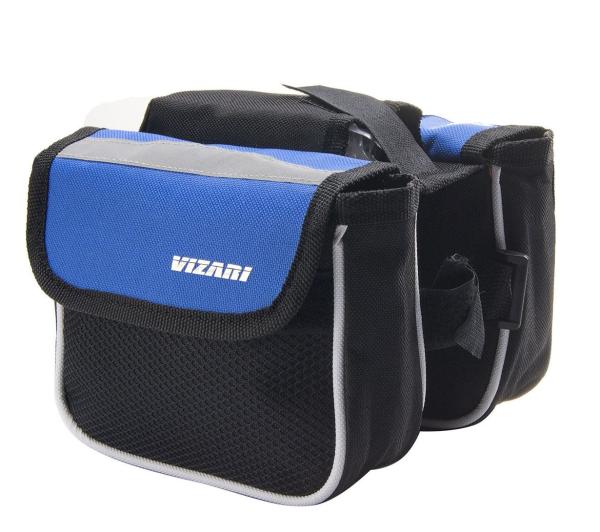 Torba rowerowa na ramę marki VIZARI model K-070. Torba posiada dwie komory główne zapinane na rzep, kieszeń na telefon oraz dwie siatkowe kieszenie na zewnątrz.