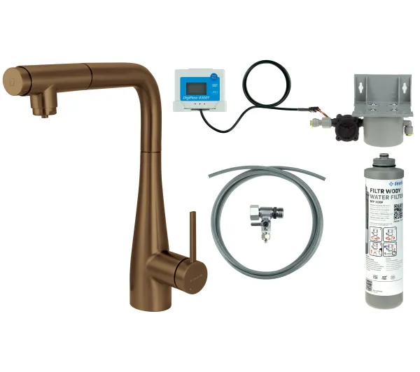 Informacje dodatkowe: aerator, bateria wysokociśnieniowa, bateria z podłączeniem do filtra, ceramiczna głowica, funkcja filtrowania wody, wyciągana wylewka jednostrumieniowa