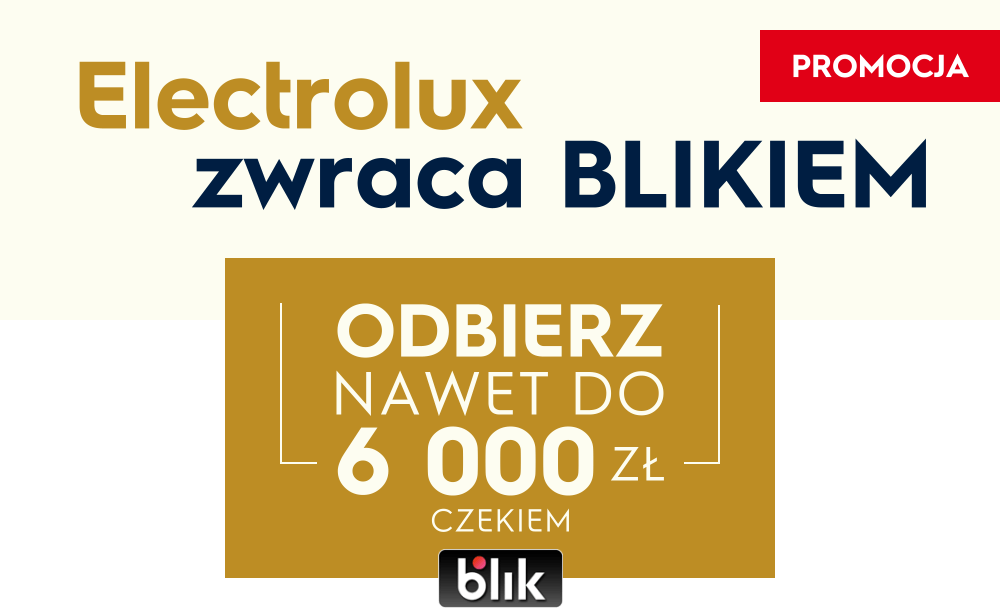 Zakupu produktów objętych promocją można dokonać do 15.12.2025 r. a zgłoszenia do promocji do 22.12.2025 r. lub do wyczerpania puli zwrotów (2,5 mln zł). Wartość czeku BLIK zależy od wartości (ceny) nabytych produktów, przy czym minimalna wartość czeku BLIK to 200 zł przy zakupach za min. 1500 zł a maksymalna to 6000 zł przy zakupach za min. 30 000 zł. Szczegóły w Regulaminie Organizatora („Electrolux Poland” sp. z o.o.) dostępnym m.in. na oleole.pl.