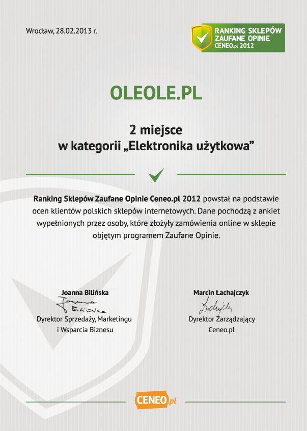 Najważniejszymi zagadnieniami branymi pod uwagę w rankingu były: jakoś obsługi, czas realizacji zamówienia oraz ogólne wrażenie dotyczące sklepu. W OleOle! wiemy, że pewność i czas realizacji zamówienia klienta są równie ważne, jak atrakcyjna i niska cena. Zapewniamy bezpieczeństwo zakupów i zmieniamy zakupy w internecie na lepsze! Specjalnie dla Państwa stworzyliśmy program "Nie kupuj kota w worku", który zapewnia klientom finalizację zakupu dopiero po sprawdzeniu towaru.
