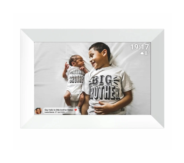 - Dodatkowe opcje: automatyczne włączanie i wyłączanie wyświetlacza o ustawionym czasie, automatyczny czujnik dopasowujący obraz do sposobu ustawienia ramki, bezprzewodowe przesyłanie zdjęć, możliwość obracania zdjęć, obsługa poprzez ekran dotykowy, odtwarzanie filmów Full HD, odtwarzanie filmów w jakości HD (720p), podświetlenie LED, prognoza pogody, przeglądanie miniatur / menedżer plików, przesyłanie zdjęć za pomocą aplikacji Frameo, różne tryby pokazu slajdów, WiFi, zegar, kalendarz, złącze USB