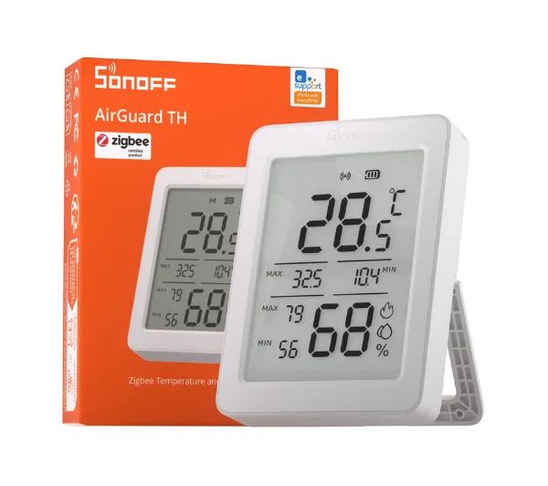 <h2>Czujnik Temperatury i Wilgotności ZigBee TH SNZB-02DR2</h2><p>Sonoff AirGuard TH SNZB-02DR2 to nowoczesny czujnik temperatury i wilgotności ZigBee z dużym ekranem LCD (Liquid Crystal Display, wyświetlacz ciekłokrystaliczny) 3,6”, który na bieżąco prezentuje aktualne parametry, dobowe wartości minimalne i maksymalne oraz poziom komfortu powietrza. Łączy wysoką dokładność pomiaru (±0,2°C / ±2% RH (Relative Humidity, wilgotność względna)) z bezprzewodową komunikacją i energooszczędnym zasilaniem bateryjnym w kompaktowej obudowie. Dzięki niemu masz pełną kontrolę nad mikroklimatem w domu, biurze czy innym pomieszczeniu – szybko, wygodnie i bez konieczności zgadywania, czy warunki są odpowiednie.</p><h2>Duży wyświetlacz LCD 3,6” – wszystko widać od razu</h2><p>Kontrastowy ekran o przekątnej 3,6” został zaprojektowany tak, aby kluczowe informacje były czytelne nawet z większej odległości. W jednej chwili sprawdzisz temperaturę, poziom wilgotności, zakres min/max z ostatnich 24 godzin oraz graficzny wskaźnik komfortu. Nie musisz uruchamiać aplikacji ani sięgać po telefon – wszystkie dane są widoczne bezpośrednio na urządzeniu, dokładnie wtedy, gdy ich potrzebujesz.</p><h2>Profesjonalna dokładność dzięki Sensirion SHT40</h2><p>Za precyzyjne pomiary odpowiada sensor Sensirion SHT40, stosowany również w rozwiązaniach przemysłowych i pomiarowych. Zapewnia stabilne, wiarygodne odczyty, które pomagają utrzymać zdrowe warunki do snu, zadbać o komfort dzieci oraz chronić rośliny, żywność czy wino przed skutkami nadmiernej wilgoci. To technologia klasy premium, która przekłada się na realne korzyści w codziennym użytkowaniu.</p><h2>ZigBee 3.0 – inteligentne sterowanie bez przewodów</h2><p>Obsługa ZigBee 3.0 gwarantuje szybkie reakcje, stabilne działanie i niskie zużycie energii. Po połączeniu z kompatybilną bramką możesz monitorować parametry w aplikacji, ustawiać powiadomienia oraz tworzyć automatyzacje, takie jak uruchomienie nawilżacza przy zbyt suchym powietrzu czy włączenie wentylacji przy nadmiernej wilgotności. To rozwiązanie, które wspiera inteligentny dom i pomaga utrzymać optymalne warunki bez Twojej ingerencji.</p><h2>Analiza historii i zaawansowane dane</h2><p>AirGuard TH zapisuje wyniki pomiarów i przedstawia je w formie przejrzystych wykresów, umożliwiając śledzenie zmian nawet z dokładnością do minut. Do dyspozycji masz statystyki dobowe, tygodniowe i wielomiesięczne, a także informacje o punkcie rosy i VPD (Vapor Pressure Deficit, deficyt ciśnienia pary wodnej). Dzięki temu łatwiej zaplanujesz wietrzenie, ogrzewanie czy podlewanie roślin oraz skuteczniej ograniczysz ryzyko powstawania pleśni i nadmiernej wilgoci.</p><h2>Szeroka integracja z systemami smart home</h2><p>Czujnik współpracuje z platformami i hubami takimi jak Sonoff, Home Assistant, Zigbee2MQTT czy SmartThings, a także z asystentami głosowymi Alexa i Google Home oraz środowiskiem Matter Bridge. Możesz zdalnie sprawdzić temperaturę, wydać komendę głosową lub uruchomić powiązane urządzenia z dowolnego miejsca. To elastyczne rozwiązanie, które dopasujesz do swojego ekosystemu inteligentnego domu.</p><h2>Tryb Proximity – monitoring bez huba</h2><p>Jeśli nie korzystasz z bramki ZigBee, możesz używać trybu Proximity i połączyć się bezpośrednio ze smartfonem przez Bluetooth (bezprzewodowa technologia komunikacji krótkiego zasięgu). Pozwala to sprawdzić bieżące parametry, przeprowadzić kalibrację, zmienić jednostki °C/°F czy wyeksportować zapisane dane. To wygodny sposób na rozpoczęcie monitorowania warunków bez rozbudowanej infrastruktury.</p><h2>Kompaktowa konstrukcja i szeroki zakres pracy</h2><p>Obudowa wykonana z trwałego tworzywa PC (Polycarbonate, poliwęglan)+ABS (Acrylonitrile Butadiene Styrene, tworzywo sztuczne o wysokiej wytrzymałości) oraz zasilanie dwiema bateriami AAA (standardowy rozmiar baterii cylindrycznej) sprawiają, że urządzenie jest mobilne i łatwe w montażu – możesz je postawić lub zawiesić w dowolnym miejscu. Sprawdzi się w sypialni, pokoju dziecka, szklarni, spiżarni, piwnicy, magazynie czy biurze. Zakres pracy od -20°C do 60°C oraz 5–95% RH zapewnia niezawodność w zróżnicowanych warunkach, dając Ci codzienną kontrolę nad komfortem i bezpieczeństwem otoczenia.</p>
