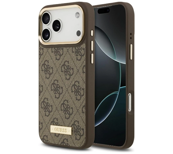 Etui Guess 4G Logo Plate MagSafe do iPhone 17 Pro Max brązowy
