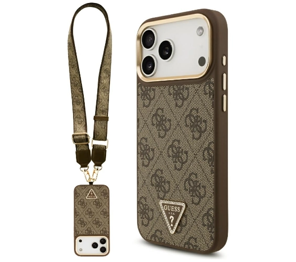 Etui Guess 4G Triangle Logo & Big Strap Metal Buttons MagSafe do iPhone 17 Pro Max brązowy