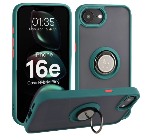 Etui Bizon z uchwytem na palec Hybrid Ring do Apple iPhone 16e Przydymione z Zieloną ramką