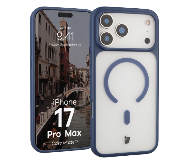 Etui Bizon MatteO z MagSafe do Apple iPhone 17 Pro Max Półprzezroczyste z niebieską ramką