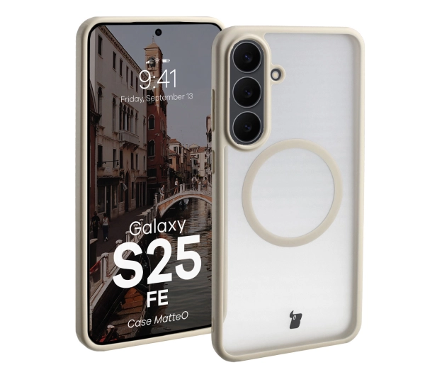 Etui Bizon MatteO z MagSafe Samsung Galaxy S25 FE Półprzezroczyste z beżową ramką