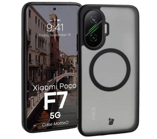 Etui Bizon MatteO z MagSafe do Xiaomi POCO F7 Półprzezroczyste z czarną ramką