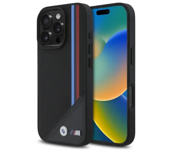 Etui BMW M Meshed Tricolor Stripes MagSafe do iPhone 16 Pro Czarny