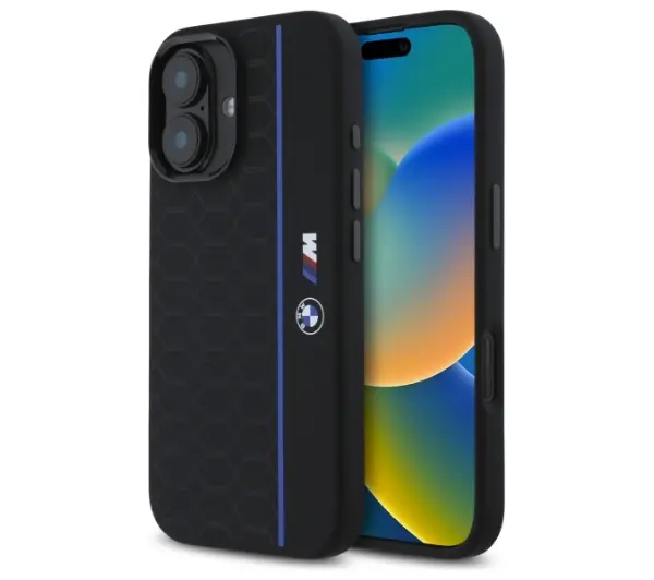 Etui BMW Silicone Hexagon Blue Line MagSafe do iPhone 16 Czarny