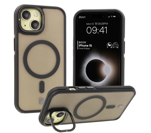 Etui Bizon Eclipse z MagSafe i podstawką do iPhone 15 Przydymione z czarną ramką