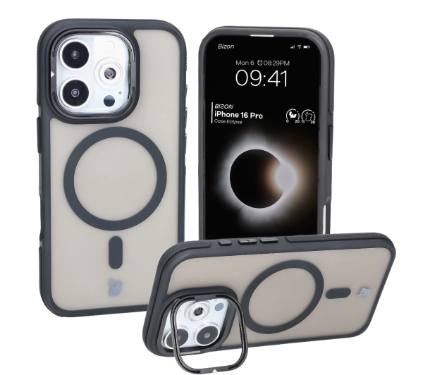 Etui Bizon Eclipse z MagSafe i podstawką do iPhone 16 Pro Przydymione z czarną ramką