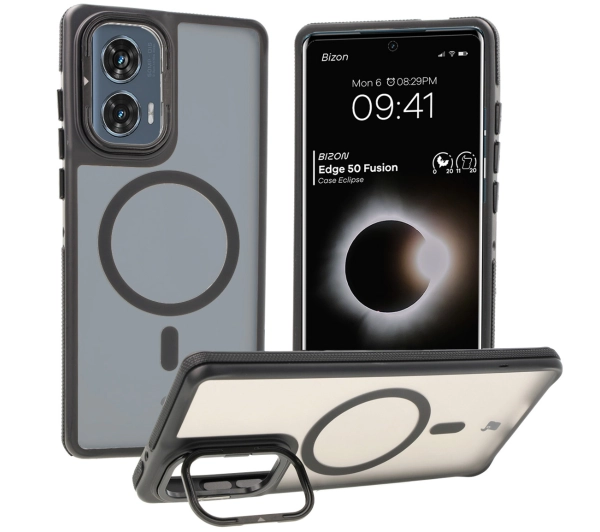 Etui Bizon Eclipse z MagSafe i podstawką do Motorola Edge 50 Fusion Przydymione z czarną ramką