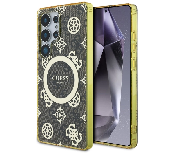 Etui Guess 4G Background Gold Electroplated Peony Pattern MagSafe do Galaxy S25 Ultra Brązowy