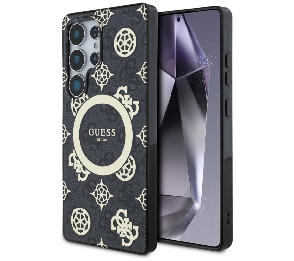 Etui Guess 4G Background Gold Electroplated Peony Pattern MagSafe do Galaxy S25 Ultra Czarny