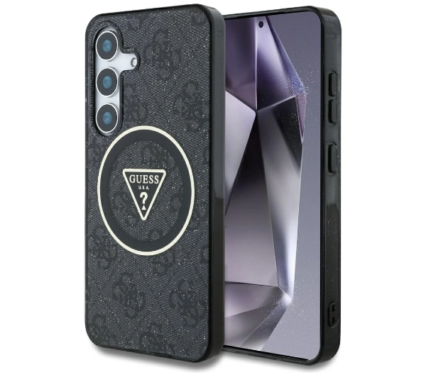 Etui Guess 4G Glitter Triangle Buttons MagSafe do Galaxy S25 Czarny