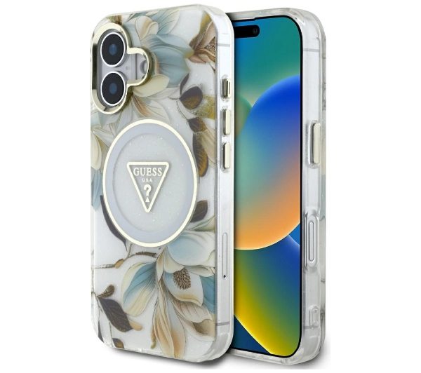 Etui Guess Glitter Flowers Triangle Buttons MagSafe do iPhone 16 Biały