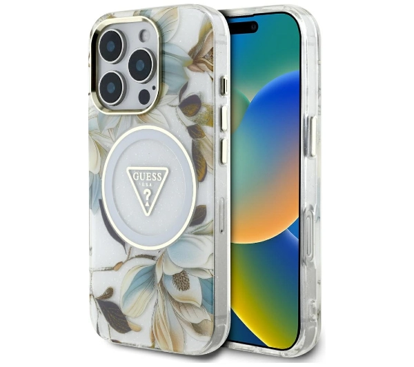 Etui Guess Glitter Flowers Triangle Buttons MagSafe do iPhone 16 Pro Max Biały