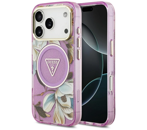Etui Guess IML Glitter Flowers Triangle MagSafe do iPhone 17 Pro Max Fioletowy