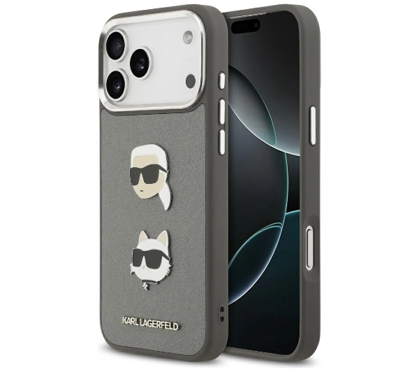 Etui Karl Lagerfeld FW Grained Karl & Choupette Heads Pins & Logo do iPhone 17 Pro Max Szary