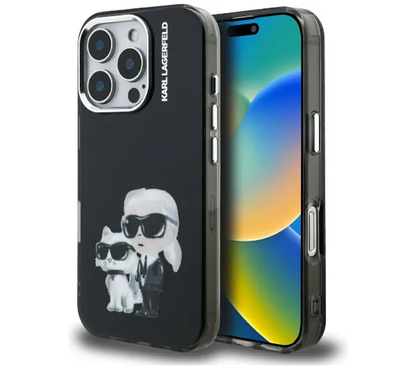 Etui Karl Lagerfeld IML Aquarelle Karl & Choupette & Logo do iPhone 16 Pro Max Czarny