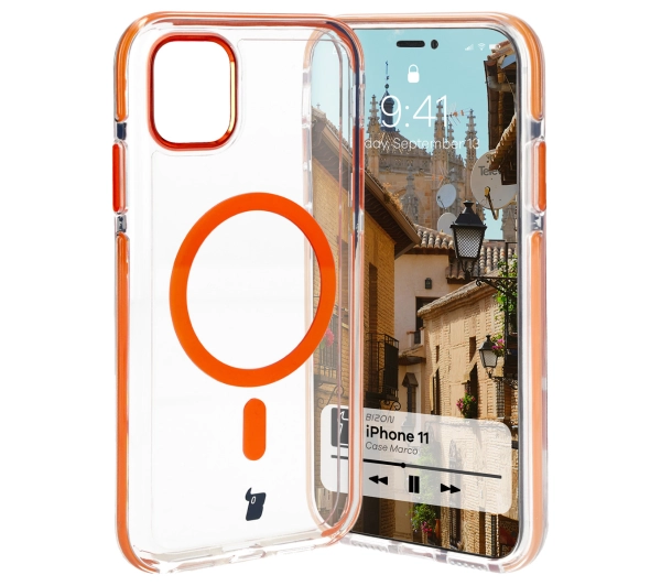 Etui Bizon Marco z MagSafe do iPhone 11 Przezroczysty z Pomarańczową ramką