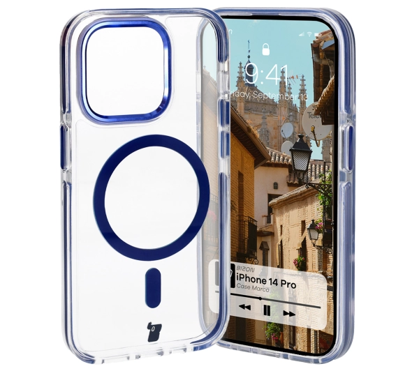 Etui Bizon Marco z MagSafe do iPhone 14 Pro Przezroczyste z niebieską ramką
