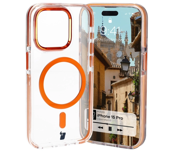 Etui Bizon Marco z MagSafe do iPhone 15 Pro Przezroczyste z pomarańczową ramką
