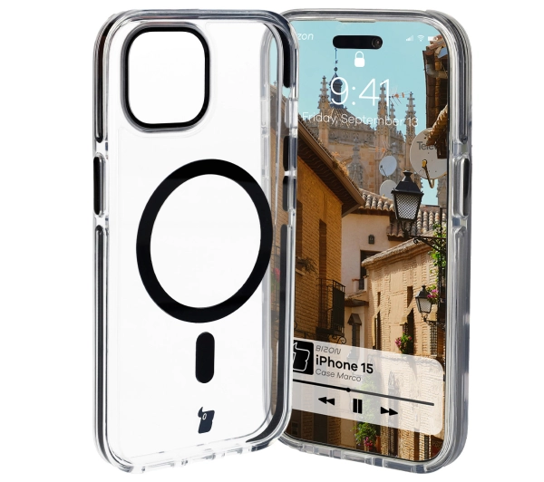 Etui Bizon Marco z MagSafe do iPhone 15 Przezroczyste z czarną ramką