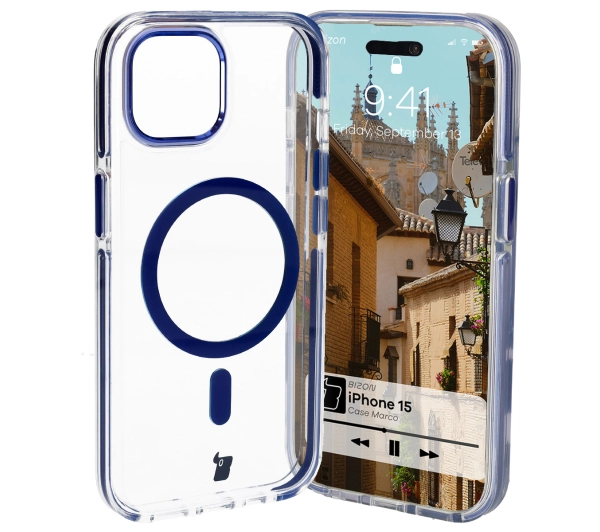 Etui Bizon Marco z MagSafe do iPhone 15 Przezroczyste z niebieską ramką