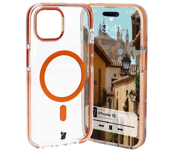 Etui Bizon Marco z MagSafe do iPhone 15 Przezroczyste z pomarańczową ramką