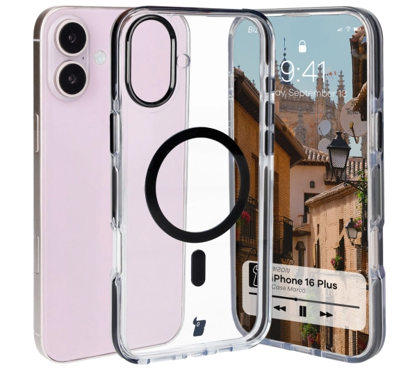 Etui Bizon Marco z MagSafe do iPhone 16 Plus Przezroczyste z czarną ramką
