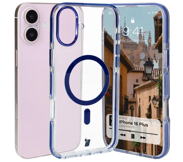 Etui Bizon Marco z MagSafe do iPhone 16 Plus Przezroczyste z niebieską ramką