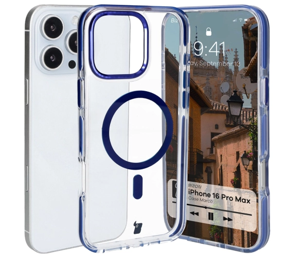 Etui Bizon Marco z MagSafe do iPhone 16 Pro Max Przezroczyste z niebieską ramką