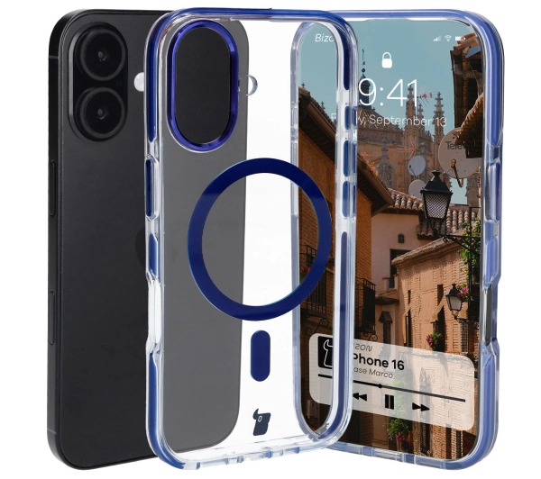 Etui Bizon Marco z MagSafe do iPhone 16 Przezroczyste z niebieską ramką