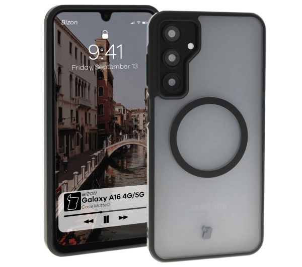 Etui Bizon MatteO z MagSafe do Galaxy A16 4G/5G Półrzezroczyste z czarną ramką