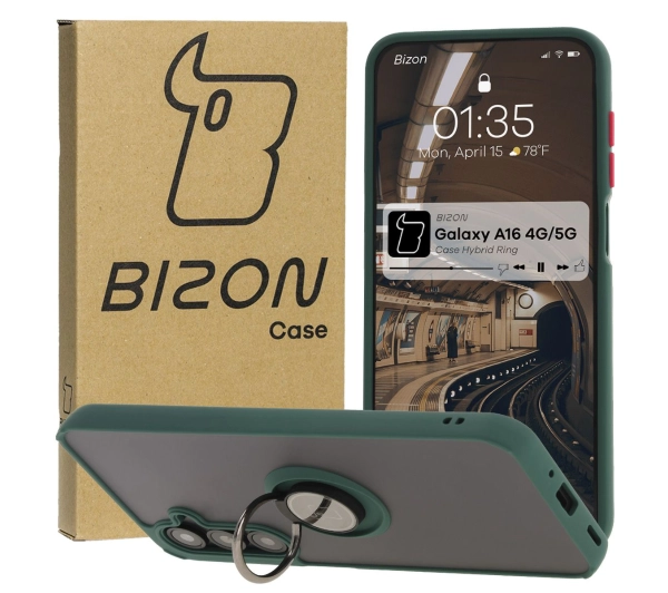 Etui Bizon z uchwytem na palec Hybrid Ring do Galaxy A16 4G/5G Przydymione z ciemnozieloną ramką