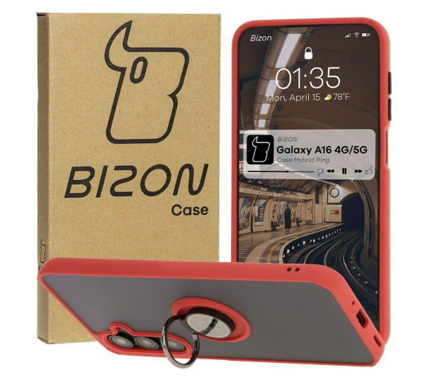 Etui Bizon z uchwytem na palec Hybrid Ring do Galaxy A16 4G/5G Przydymione z czerwoną ramką