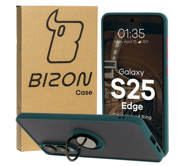 Etui Bizon z uchwytem na palec Hybrid Ring do Galaxy S25 Edge przydymione z Ciemnozieloną ramką