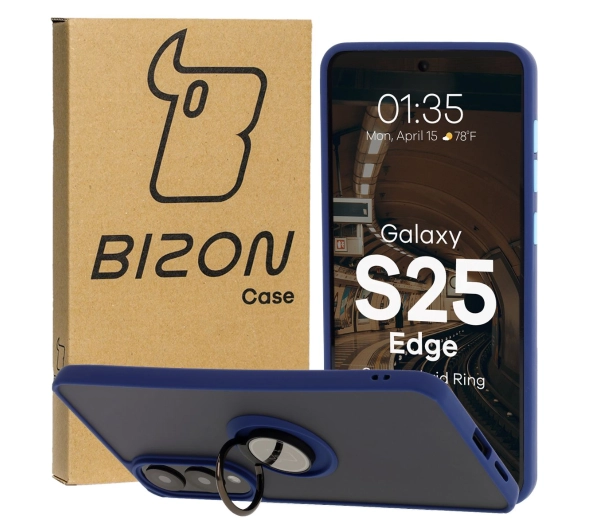 Etui Bizon z uchwytem na palec Hybrid Ring do Galaxy S25 Edge przydymione z Granatową ramką