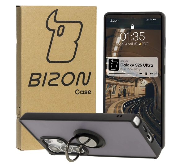 Etui Bizon z uchwytem na palec Hybrid Ring do Galaxy S25 Ultra Przydymione z czarną ramką